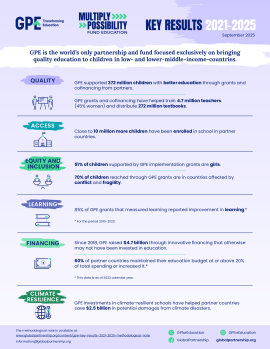 Over the 5 years of the GPE 2025 strategic plan, GPE has achieved impressive results in access, equity and inclusion, quality teaching, learning, climate resilience and financing.  This factsheet details the key results in these areas.